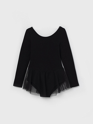 Купальник с длинным рукавом и с юбкой из сетки в цвет основного полотна. Вырез горловины и проймы ножек окантованы бейкой из основного полотна.