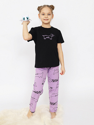 Комбинированная пижама из футболки и брюк. Футболка гладкокрашенная, свободного покроя с коротким рукавом. Горловина обработана притачной бейкой из рибаны с лайкрой. Перед оформлен небольшим принтом. Прямые брюки умеренного объёма выполнены из набивного полотна дополнительного цвета. Цельнокроенный пояс обработан плоским швом вподгибку с одновременным прокладыванием резинки.