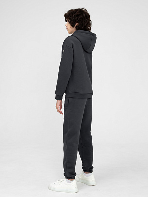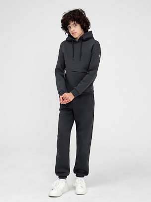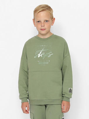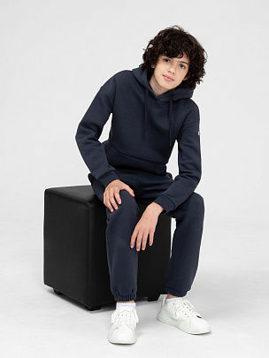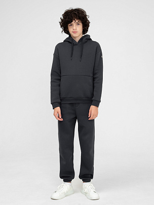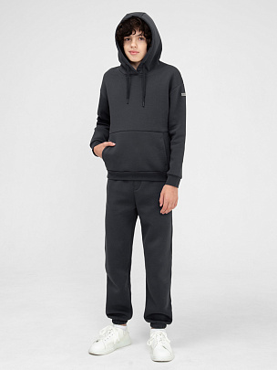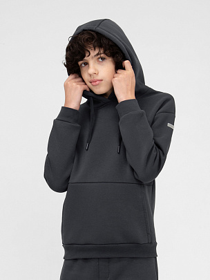 Толстовка для мальчика с капюшоном со шнурком, карман-кенгуру. Манжеты и пояс из эластичной рибаны. На рукаве декоративная силиконовая нашивка.