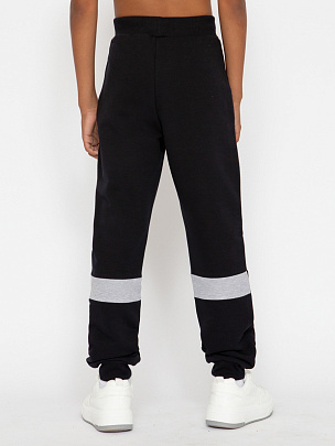 Брюки с притачным поясом и манжетами. В пояс вставлена резинка и функциональный шнур. Пояс и манжеты выполнены из полотна с эластаном. В боковой части брюк располагаются карманы. На передней части в области колена расположен декоративный подрез. На задней части брюк расположена декоративная вставка контрастного цвета. Карман декорирован вязаной нашивкой.