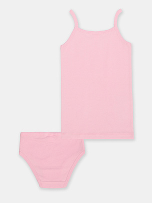 Гладкокрашенный комплект, выполненный полностью в одном цвете. Майка на бретелях из основного полотна. Срезы пройм и горловины окантованы бейкой из основного плотна. Перед оформлен шелкографией. Верх трусов обработан плоским швом вподгибку с одновременным прокладыванием резинки. Проймы ножек обработаны окантовкой из основного полотна.