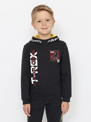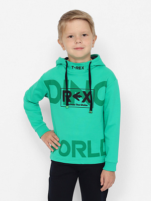 Толстовка с длинными рукавами, притачным поясом и манжетами. Манжеты и пояс выполненя из полотна с добавлением эластана. Капюшон с притачной планкой и подкладкой контрастного цвета, планка декорирована принтом. Перед декорирован принтом "тираннозавр Рекс".