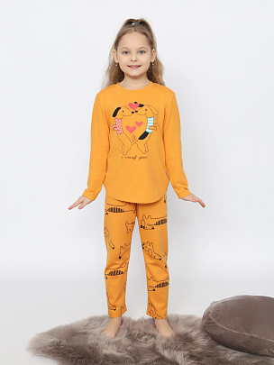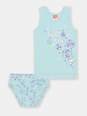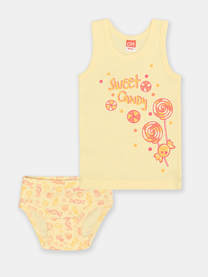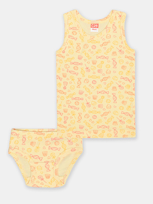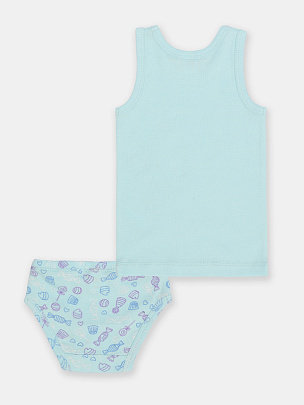 Комплект из гладкокрашенной майки и набивных трусов. Майка с плечом. Горловина и проймы обработаны окантовкой из основного полотна. Перед оформлен шелкографией. Верх трусов обработан плоским швом вподгибку с одновременным прокладыванием резинки. Проймы ножек обработаны окантовкой из основного полотна.