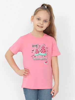 Футболка с коротким рукавом. Горловина круглая, обработана узким воротником из полотна с эластаном. Перед оформлен ярким принтом.